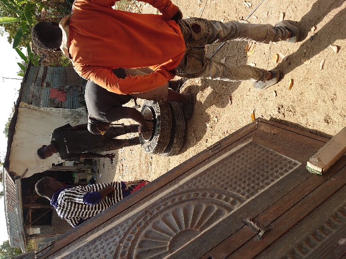 Four adult males are present in an outdoor, dusty work area in Adankolo, Nigeria. In the immediate foreground, a large, ornate wooden door with carved decorative patterns lies horizontally on the sandy ground, exhibiting a small green brush on its edge. Centrally, one man, wearing a dark t-shirt and light shorts with yellow glasses positioned on his head, is bent over, actively mixing a substance within a metal bowl. This bowl rests on a stack of two vehicle tires. To his left, another man in a blue and white striped long-sleeved shirt and patterned trousers observes the activity. A third man, clad in a dark t-shirt and dark trousers, stands behind the mixing individual, also observing. To the right, a fourth man, wearing an orange long-sleeved shirt and light-colored jeans, stands with his hands on his hips, facing away from the camera, and observing the central activity. The background features several informal structures, including a corrugated metal shack and a building partially covered with white fabric, under a clear sky. Bright sunlight illuminates the scene, casting distinct shadows.