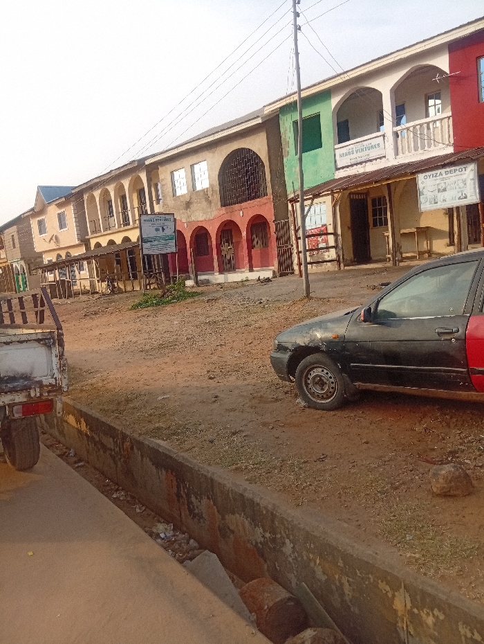 A street scene shows a row of two-story buildings in various states of repair, painted in shades of beige, red, and green. Several businesses have signs, including "Herbs Ventures" and "Oyiza Depot". In the foreground, a black and red car and a white truck are parked on a dirt road. A concrete drainage ditch runs along the edge of the road, filled with debris. Overhead, power lines crisscross the sky.