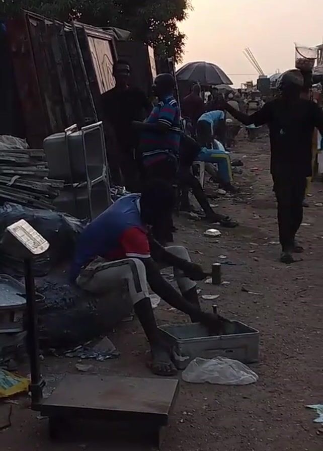 busy outdoor scene with several people. In the foreground, a man is seated, sorting through items in a grey container with a hammer. To his left is a scale. Behind him, piles of discarded metal objects, including what appear to be sinks and cabinets. Several other people are visible in the background, some standing and watching, others walking around. There is a wide umbrella providing shade in the background. The ground is dusty and littered with debris. The lighting suggests it is either early morning or late afternoon.