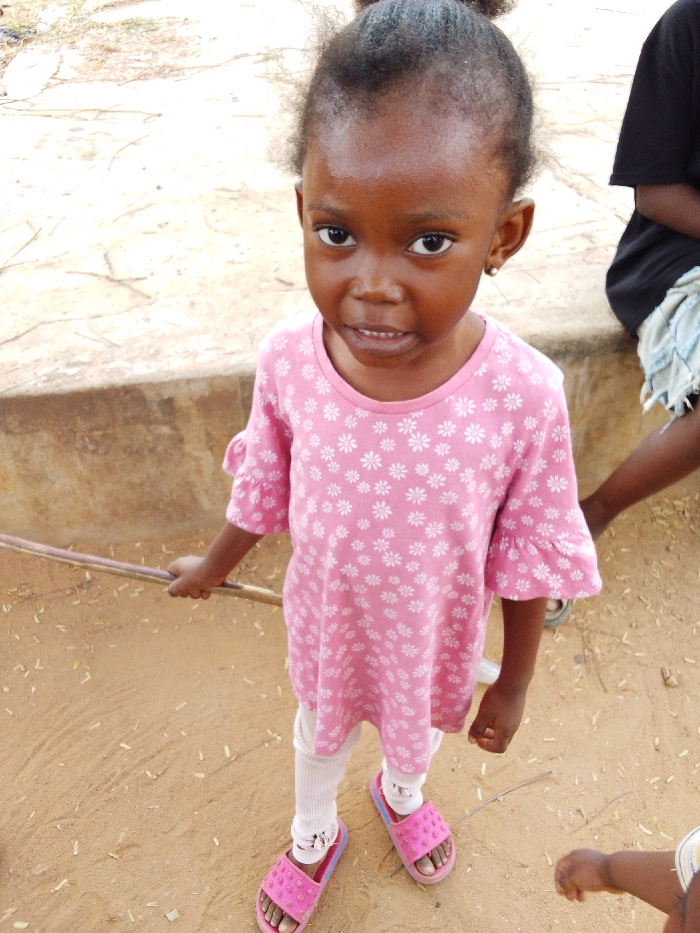 In Adankolo, Nigeria, a young Black girl, approximately three to five years old, stands centered and faces forward, looking directly into the camera