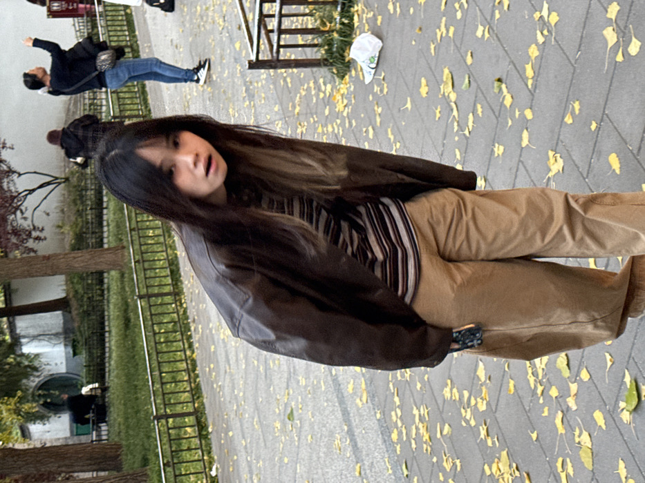 The image depicts an outdoor scene in Xicheng District, China, characterized by autumn foliage. In the foreground, a person with long, dark hair featuring lighter ends is positioned centrally, leaning forward with a slightly open mouth and a direct gaze towards the viewer. They wear a dark brown leather jacket over a horizontally striped shirt (dark, light, and reddish-brown stripes) and light brown, wide-leg trousers. A black smartphone with a textured case is held in their right hand. The ground beneath is a grey paved surface covered extensively with fallen yellow ginkgo leaves. In the mid-ground, to the right of the primary subject, another individual in a dark long-sleeved shirt and blue jeans is observed with their right arm raised, appearing to point or photograph an object above. A dark crossbody bag is visible. Further back, another person in a dark, possibly plaid, jacket is partially visible. To the far left, a person in dark attire is partially obscured by trees. The background features a green grassy area bordered by a dark metal fence. Beyond the fence, traditional Chinese architectural elements are present, including a white wall with a distinctive circular opening. Several trees with sparse foliage and bare branches are visible, along with a small tree exhibiting red/purple leaves. A crumpled white plastic bag is on the ground near a dark metal railing in the lower right quadrant. The overall environment suggests a park or a public pedestrian area during the autumn season.