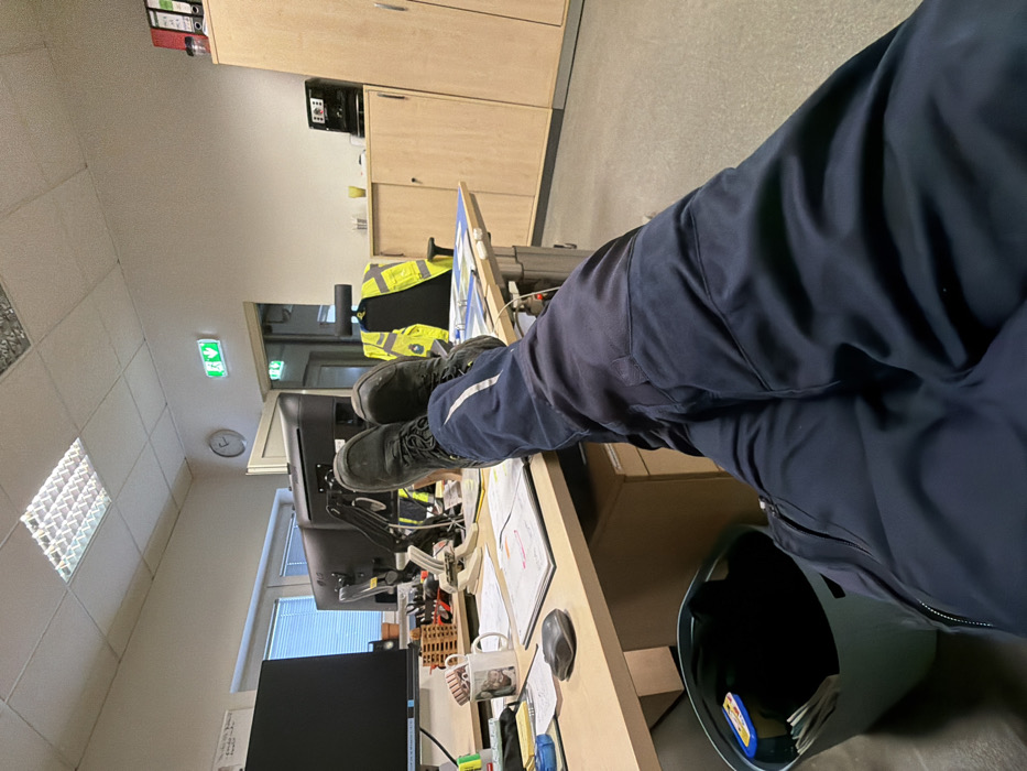 An individual's legs, clad in dark blue work trousers with a white diagonal stripe on the outer right leg, and dark lace-up work boots, are depicted resting on a light wood-grain office desk. The perspective is first-person, looking down at the legs and across the office environment. On the desk surface, directly behind the boots, are two black computer monitors on a shared stand. To the left of the boots, a brown wooden desk organizer holds pens, a white mug with an illustration, a dark gray computer mouse, and various documents, including one with a yellow sheet. Cables are visible on the desk. A dark gray or teal waste bin containing papers and a small object is on the floor to the left of the legs. In the midground, behind the desk, a light-colored office chair with a black seat and backrest features a bright yellow high-visibility safety vest draped over its back. To the right, a light wood-grain storage cabinet supports a black coffee machine, a yellow cup, and a clear container. Further right, a taller, matching cabinet holds red and green binders on an upper shelf. The background shows light-colored walls. A window with light-colored horizontal blinds is on the left. A doorway leads to another area, with an illuminated green exit sign above it and a round wall clock to its left. The ceiling comprises square acoustic tiles with a centrally located, illuminated rectangular fluorescent light fixture. The scene is located in an office within Grevenmacher, Luxembourg.