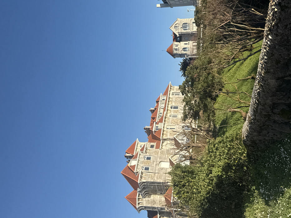 The image depicts an exterior scene in Biarritz, France, under a clear, bright blue sky. In the foreground, a low, textured stone wall, topped with small pebbles, runs horizontally across the bottom third of the frame. Immediately in front of this wall, a patch of green grass is visible, interspersed with numerous small white flowers. The midground is dominated by a sloping green hillside covered in grass and a variety of trees and shrubs. Some trees possess bare, deciduous branches, while others retain dense green foliage. This vegetation partially obscures the lower sections of the buildings situated on the higher ground. In the background, two prominent multi-story buildings, characteristic of late 19th or early 20th-century architecture, are visible. The larger building on the left features a light-colored stone facade with multiple ornate red-tiled roofs, including several gables and turrets with conical tops. Numerous windows with white frames are distributed across its various levels, and a small balcony is discernible on its right side. Further to the right and slightly behind, a smaller building with a similar architectural style stands, also exhibiting a light-colored facade and a distinctive red-tiled conical roof on a prominent turret. A glimpse of a third, lighter-colored, more rectilinear building is visible on the far right edge of the frame. No individuals are present in the scene. The lighting indicates direct sunlight.