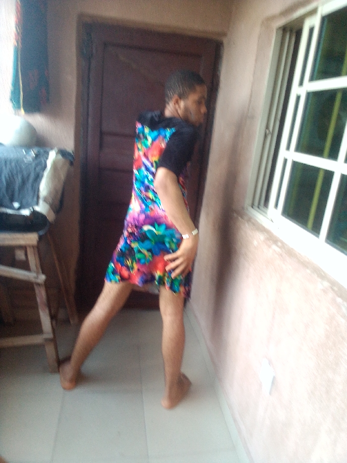 The scene is located in what appears to be an indoor or semi-enclosed space in Onitsha, Nigeria. A barefoot male subject, appearing young, stands with legs slightly apart, facing towards the right side of the frame with his head turned slightly left. He wears a short-sleeved garment featuring black sleeves and a vibrant, multi-colored pattern of floral or abstract design over the torso, extending to above the knees. A silver-toned bracelet is visible on his left wrist, and his right hand rests on his right thigh. The environment includes light brown or beige painted walls and a light-colored tiled floor. A dark brown wooden door is visible in the left background. On the right wall, a window with white frames and green-tinted glass is present, featuring multiple panes and vertical mullions. A small white wall fixture is positioned below this window. In the far left background, a partial view of a light-colored wooden stool or ladder is seen, draped with a dark fabric. A dark green and yellow curtain hangs on the left wall near the door.