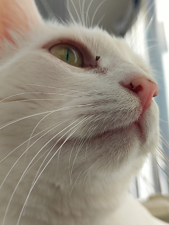 - "A close-up, low-angle photograph captures the left side profile of a white domestic cat" by FM-pJyc73, licensed under CC BY 4.0