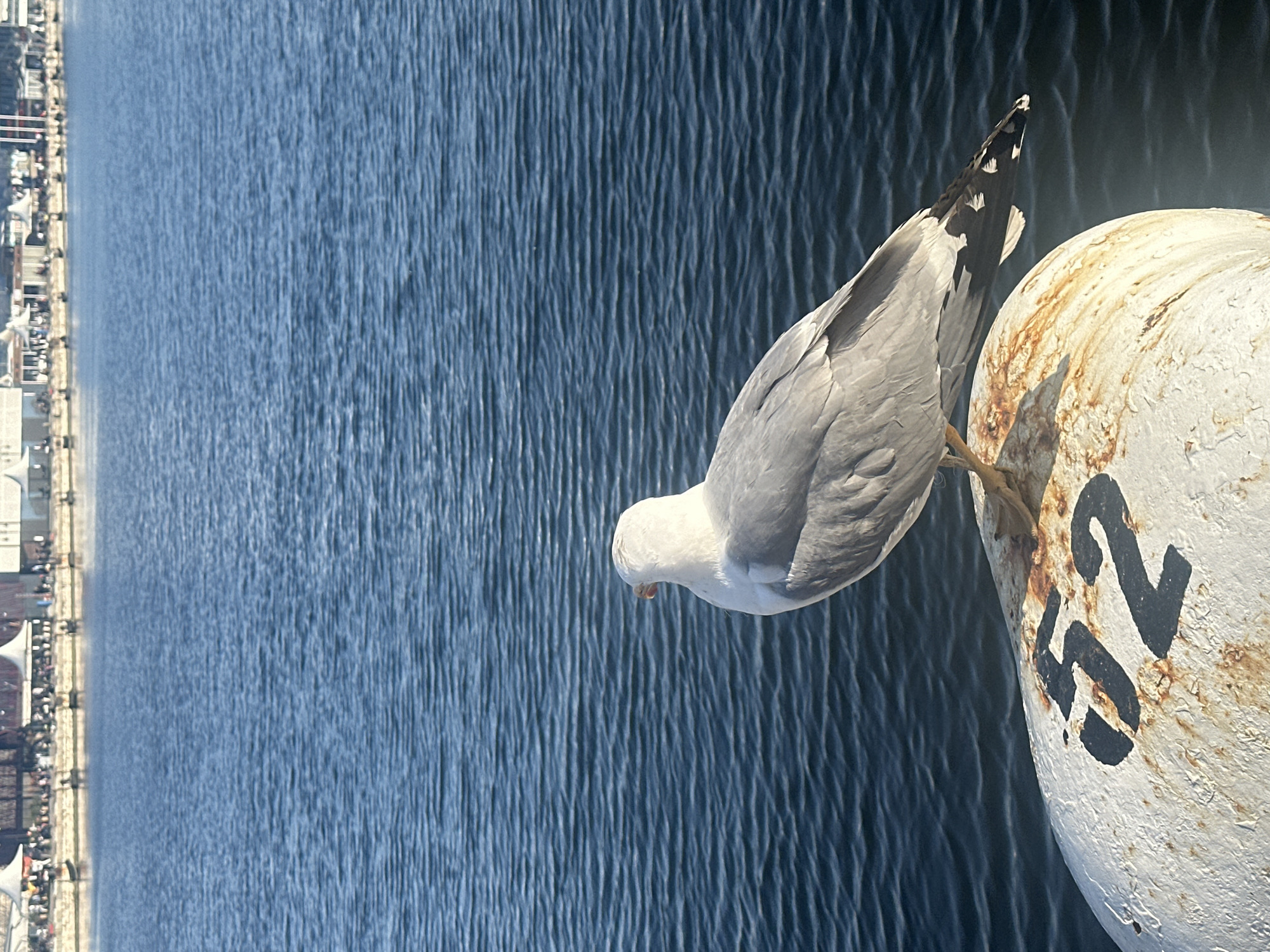 A seagull perches on a weathered white buoy marked with the number 52, likely in the sea off Varna, Bulgaria
