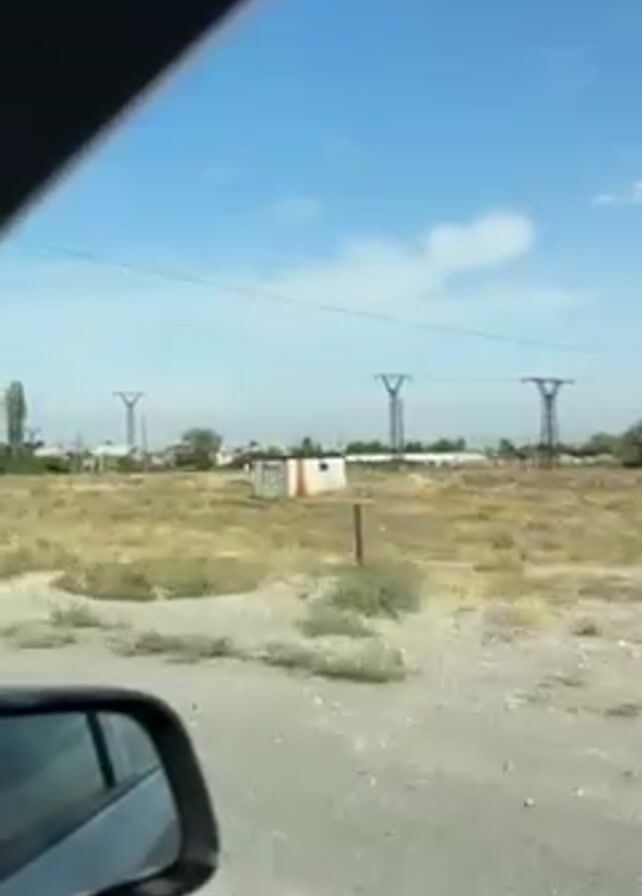 view from inside a car, looking out the passenger-side window. The car is driving on a gravel road, with dry, sparse vegetation visible to the right. Power lines and pylons are visible in the distance against a bright blue sky with scattered white clouds. A small, run-down building with a red roof can also be seen. The car's side mirror is visible in the lower left corner of the frame.