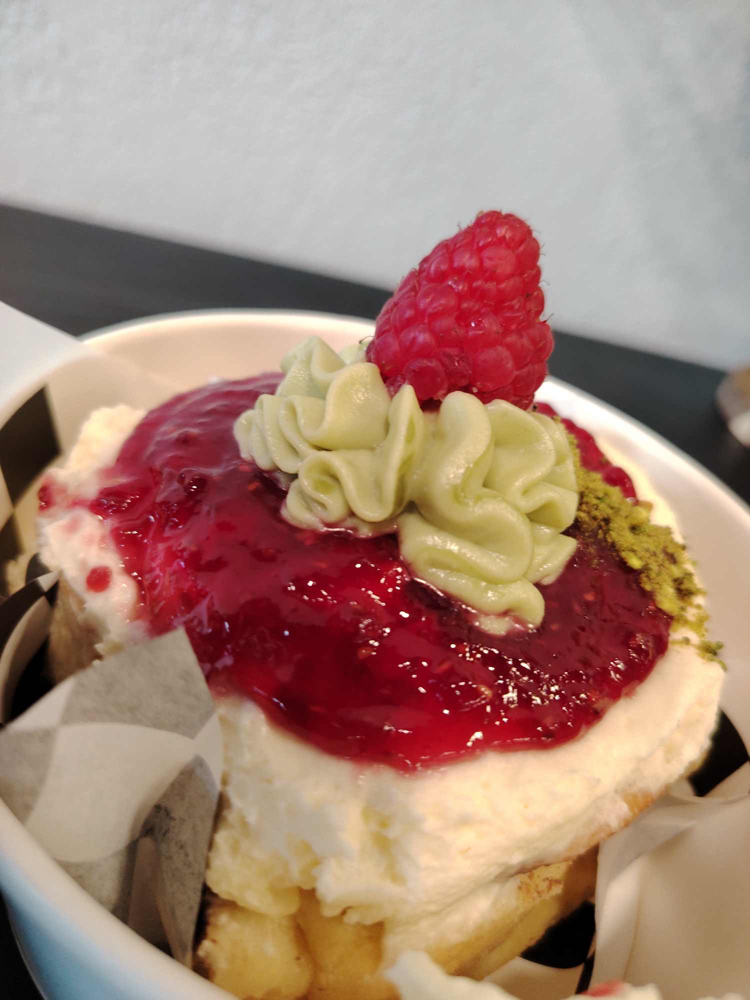 A close-up, slightly overhead view depicts a dessert served in a white bowl, resting on a dark grey surface. The dessert features a base of light-colored cake or bread pieces, topped with a thick layer of white cream. This is covered by a bright red raspberry compote containing visible seeds. Several piped swirls of light green cream are arranged on the compote, capped by a single fresh red raspberry. Finely crushed green pistachios are sprinkled on one side of the white cream layer. The interior of the bowl is partially lined with a black and white checkered paper wrapper. A light grey, textured wall forms the background above the dark surface. No individuals or actions are present. Location: Unknown, Unknown.