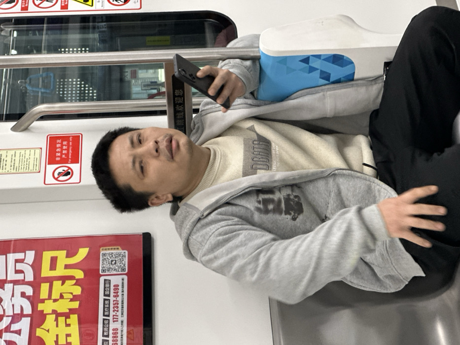 A man sits on public transportation, appearing to be using a smartphone. He wears a grey zip-up hoodie over a cream-colored sweater. He has black hair and a neutral expression. The interior of the vehicle is visible, including a safety rail, signs in Chinese, and a blue and white headrest. The man also wears black pants.