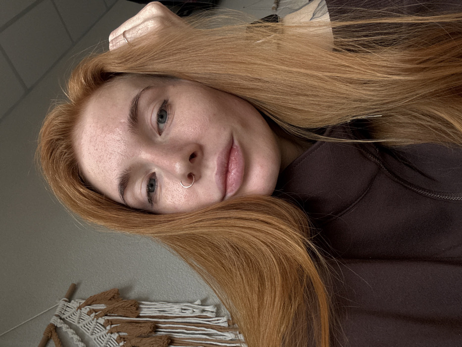 The image displays a close-up, eye-level portrait of a single female subject in an indoor setting. The subject has fair skin with visible freckles, long, wavy, reddish-orange hair, blue-grey eyes directed towards the camera, and full, slightly parted lips. A silver-colored hoop piercing is present in her left nostril. She is wearing a dark brown zip-up garment. Her right hand, featuring a silver-colored ring on the ring finger, is positioned near the top of her head, partially obscured by her hair. A subtle, dark mark is visible on her upper right shoulder area. The background consists of a plain, light-colored wall. On the left side of the frame, a macrame wall hanging crafted from white and brown/tan fibers, suspended from a wooden dowel, is partially visible. The location is an unknown indoor setting within Unknown, Unknown.