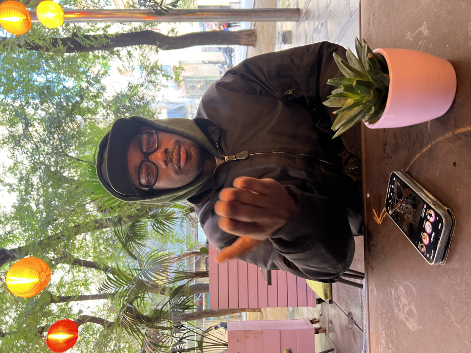 A male subject is seated at an outdoor cafe table in Barcelona, Spain. He is positioned centrally, looking directly at the camera. He wears a dark green hooded sweatshirt under a dark bomber jacket and a dark baseball cap, with the hood up over the cap. He wears dark-rimmed glasses and has a silver nose ring. His left hand is raised in front of him, fingers slightly curled, palm facing the camera. On the dark-colored table in front of him, a silver-cased smartphone with a cracked screen is visible, displaying social media icons on its lock screen. To the right of the phone is a small succulent plant in a pink pot. The background shows an outdoor dining area with a light pink slatted partition and matching seating to the left. Lush green trees, some appearing palm-like, and others with smaller leaves, are prominent. Hanging from tree branches are three illuminated circular paper lanterns: one red on the left and two orange/yellow ones further right. Beyond the trees, a street scene is visible with what appears to be a building facade and parked scooters, and a blurred figure in the distance on the right. The lighting suggests late afternoon or early evening.