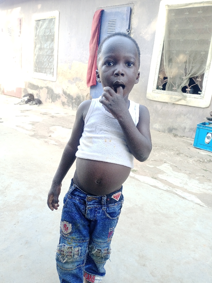 A young child, approximately 3-5 years old, with dark skin and short dark hair, stands centrally in an outdoor area of Unknown, Unknown