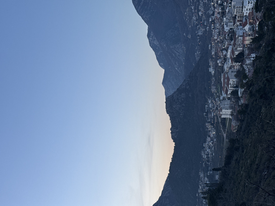 The image displays an elevated panoramic view of the town of Miljevci, Montenegro, situated within a valley surrounded by prominent, dark mountains under a twilight sky. The upper two-thirds of the frame consists of a clear sky, transitioning from light blue at the zenith to a pale orange-pink hue near the horizon line. Faint, diffuse clouds are present in the mid-left sky. Multiple layers of rugged, dark mountains, appearing rocky and partially vegetated, form the background and mid-ground, silhouetted against the sky. The town occupies the valley floor, comprising numerous buildings, predominantly multi-story residential structures with varied roof colors, including red-brown and lighter tones. Artificial lights from streetlights and buildings are illuminated throughout the town, suggesting evening or early morning conditions. Roads are visible winding through the urban area. The foreground consists of a steep, dark slope covered in sparse, low-lying vegetation and some bare tree branches, indicating a high vantage point for the photograph. No individuals or explicit interactions are discernible.