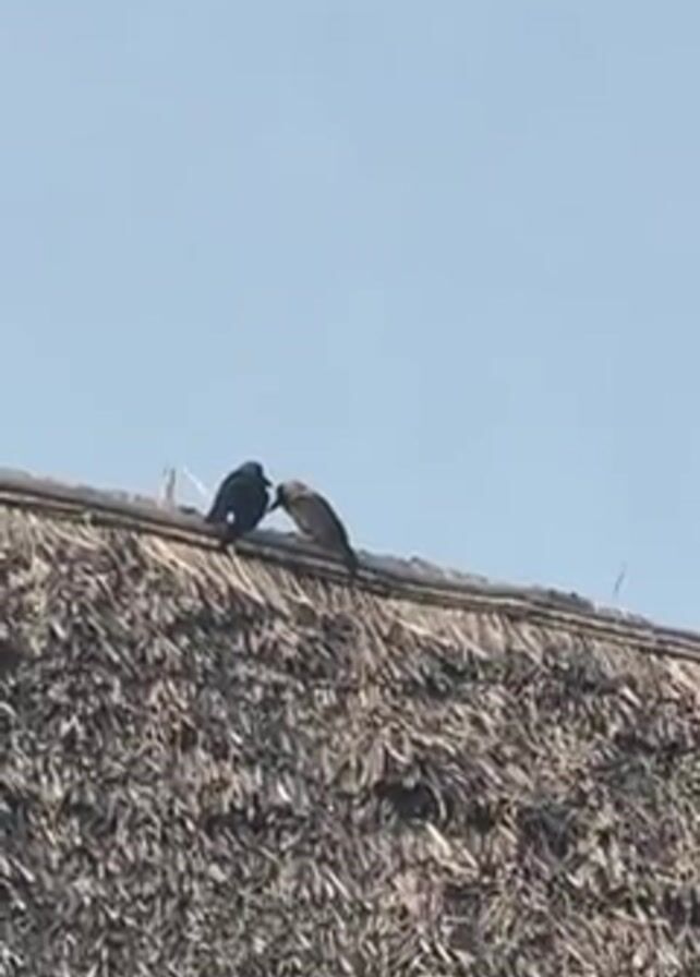 Two birds perch on a thatched roof against a clear blue sky. The bird on the left is black, while the bird on the right is gray. The black bird appears to be feeding the gray bird.