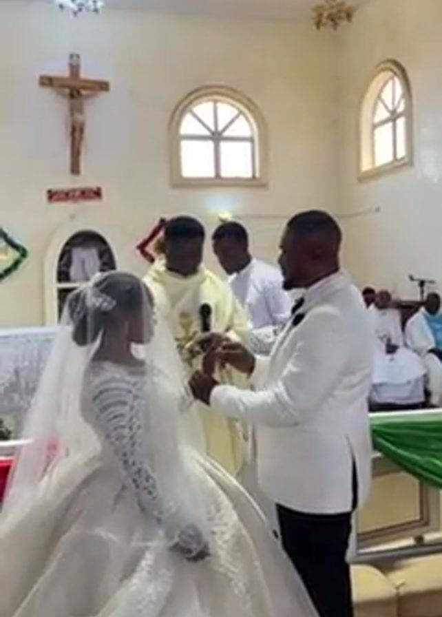 A wedding is taking place inside a church. A groom in a white suit is placing a wedding ring on the finger of a bride who is wearing a white, long-sleeved, ballgown-style dress with a long veil. The wedding officiant in a white cassock and stole stands between them. Additional church officials are seated in the background. The church features cream colored walls, religious art and Christmas decorations. There is a large crucifix on the wall behind the wedding party.