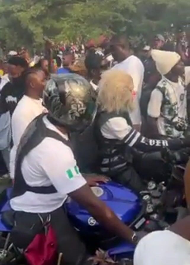 crowd of people gathered outdoors, seemingly in a public space. Many individuals are wearing casual clothing, with some in white t-shirts. A few people stand out, including one wearing a lion-like mask and another in traditional attire. Several motorcycles are visible, one blue and another partially obscured. Some individuals are filming or taking pictures with their phones. The atmosphere appears lively and festive. Trees are in the background, suggesting the location might be a park or open area.