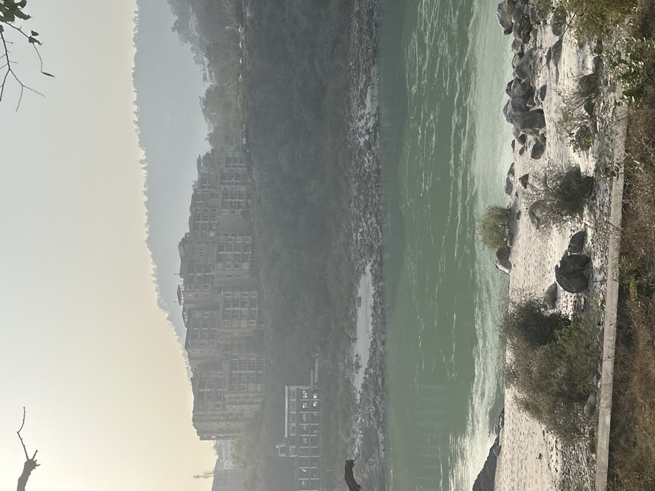 The image depicts a hazy, daytime riverine scene in Jonk, India. A wide, greenish-blue river flows from left to right, featuring visible ripples and white foam patches on its surface. The immediate foreground shows a dry, light-colored sandy bank with sparse, low-lying scrub vegetation and scattered large, grey rocks. A concrete barrier or low wall runs horizontally along the bottom edge of the frame. On the opposite bank of the river, another sandy and rocky shoreline is visible. A small cluster of approximately 5-7 indistinct human figures is gathered on a sandy patch close to the water's edge on this far bank. Behind them, further up the slope, a multi-story building with numerous windows is partially visible amidst the haze. Dominating the background is a large complex of interconnected multi-story buildings, likely residential or a hotel, situated on an elevated plateau or hillside. These structures feature multiple balconies and windows, appearing muted due to the atmospheric haze. Behind and above these buildings, a densely forested hillside rises, its contours softened and blurred by the widespread atmospheric haze. Bare, dark tree branches partially intrude into the top-left and top-right corners of the frame. The sky is bright but uniformly hazy, creating a soft, diffused light over the entire landscape.