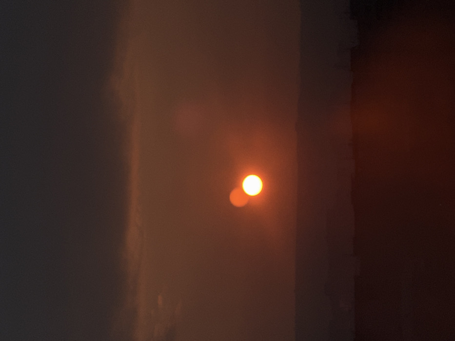 The image portrays a hazy, orange-tinted scene, likely caused by smoke or dust. A bright, round sun is visible, slightly blurred, with a smaller, out-of-focus light source appearing below it. The background is obscured, with dark, undefined shapes framing the central orange hue. The overall impression is of a sun shrouded in a smoky atmosphere.