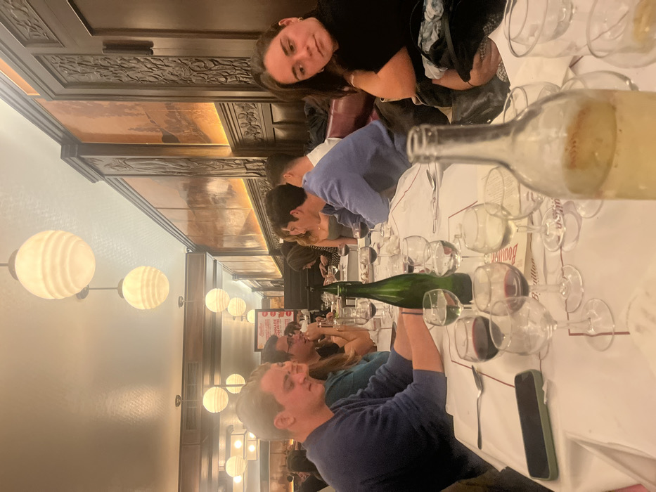 This image captures the interior of Bouillon République, a traditional French restaurant located at 1 Boulevard du Temple, 75003 Paris, France. The scene features a long table draped with white tablecloths, set for multiple diners. Approximately seven individuals, appearing to be young adults, are seated at this table, engaged in conversation and dining. The restaurant's decor includes a high ceiling from which several large, spherical, ribbed pendant lights emit a warm glow. The walls are paneled with dark wood, featuring intricate carvings and landscape-themed murals above. In the foreground, on the left, a man in a blue sweater is seated, looking down at a dark-colored smartphone placed face-down on the tablecloth. To his right, the table is laden with multiple wine glasses, some containing red wine, others empty or holding water. An empty green wine bottle stands upright, and a mostly empty clear glass bottle, likely for white wine, is in the extreme foreground, partially out of focus. Further down the table, a small white dish holds what appears to be appetizers. On the right side of the foreground, a woman with dark hair, wearing a black top, is seated with her right arm resting on the table, observing the scene with a contemplative expression. Other diners are visible in the mid-ground and background, including a man in a light blue top with his back partially to the camera. The white tablecloth is branded with "Bouillon République" in red text. The overall environment is well-lit and bustling.