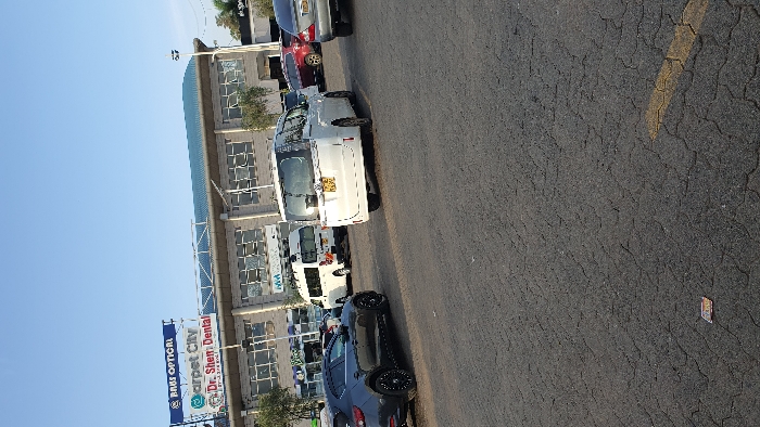 This image displays an outdoor commercial parking area in Kisumu, Kenya, situated near the Kisumu Mega City complex on the Kisumu-Kakamega Highway