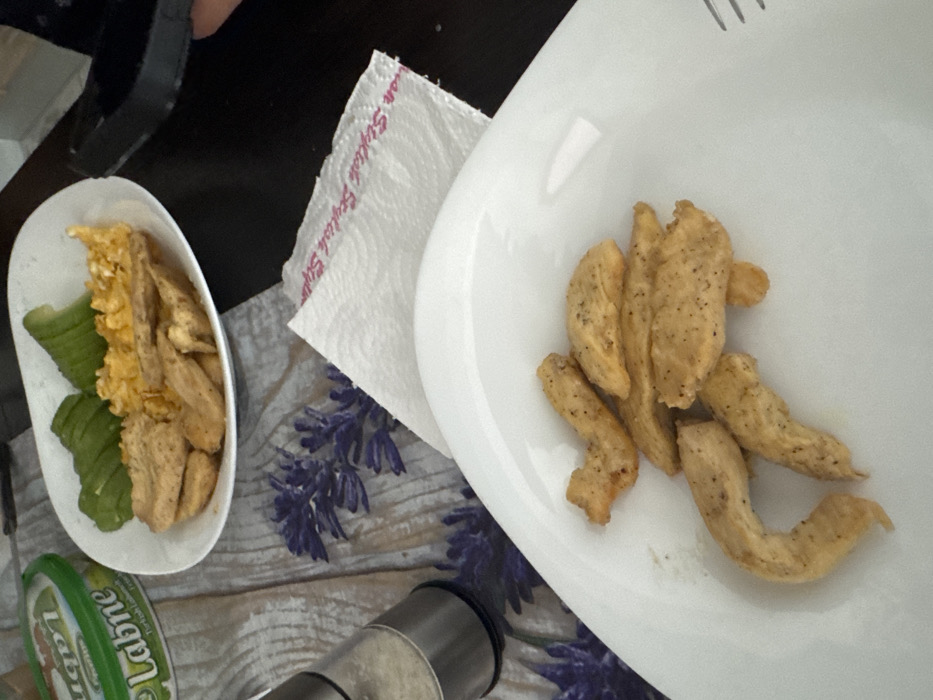The image displays a meal setting on a table, with no individuals present. In the foreground, a white, rectangular plate holds several pieces of cooked, seasoned chicken strips. Further back and slightly to the left, a silver-toned salt grinder with a clear base containing white granules is positioned on a light-colored placemat featuring a purple lavender pattern. Adjacent to the salt grinder and behind the first plate, another white, rectangular plate contains additional cooked chicken strips, a portion of scrambled eggs, and several slices of green avocado. To the left of this second plate, a green plastic container labeled "Labne Turkish Labneh" is visible. A white paper napkin, printed with red text that reads "Styloish English Style," is positioned between the foreground plate and the plate with eggs and avocado. The background is dark, and the specific location within Shumen, Bulgaria, is not discernible from the visual evidence provided.