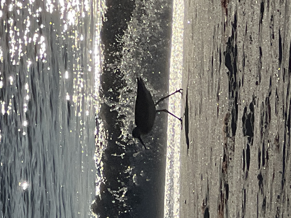 A dark bird clings to a textured, silvery pillar with its long legs. Its head is pointed downward. The bird is mostly obscured by shadows and highlights. To the left, there's shimmering water with bright reflections. Another textured surface stands to the right of the pillar, partially shadowed with dark, vertical streaks. The image seems to be captured in bright sunlight, causing stark contrasts between light and shadow.