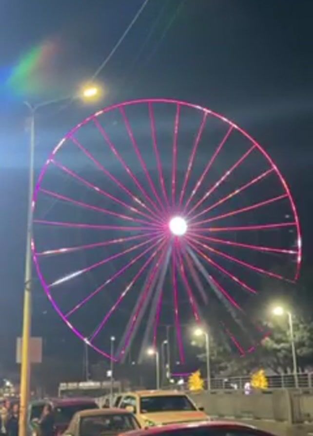 At night, a Ferris wheel rotates through various colors