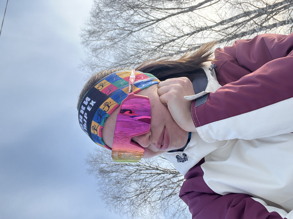 A single female individual is depicted outdoors, positioned off-center to the left, looking slightly upwards and to her right. The location is presumed to be Сергино, Russia. She wears large, reflective pink-orange-yellow mirrored sunglasses that obscure her eyes. A dark headband with a multi-colored checkered pattern featuring stick figures and Russian text "ОГНИ ПИРЕХ" (OGNI PIREKH) is worn across her forehead. Her dark hair is visible beneath the headband. She is dressed in a two-tone winter jacket, predominantly cream/off-white on the torso with maroon/burgundy sections on the outer sleeves and shoulders. Her right hand is casually placed against her jawline. The background consists of a clear, bright blue sky and numerous bare deciduous trees with light-colored trunks and branches, indicating a cold weather season like winter or early spring. The scene is brightly illuminated by natural light.