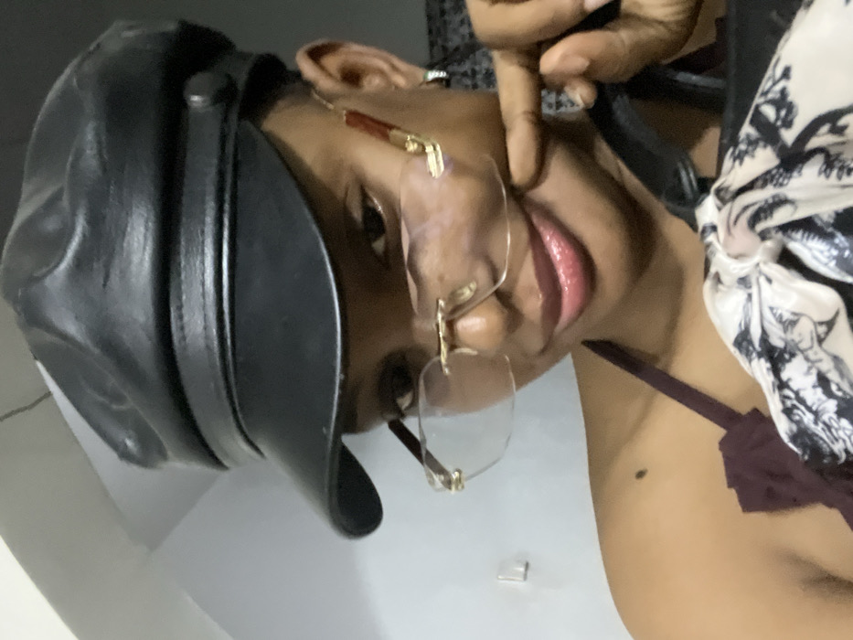 A dark-skinned person with clear glasses and a black leather cap poses for the camera. Their left finger is pressed against their cheek. They wear a white and black patterned top. The person is slightly tilted to the left. A maroon ribbon lies diagonally across the chest. A mole is visible on the right shoulder.