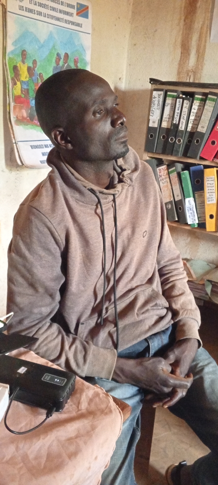An adult dark-skinned male is seated indoors, looking upwards and slightly to his right with a pensive expression. He has short hair and light facial stubble. He wears a light brown hooded sweatshirt with dark drawstrings and blue denim jeans; his hands are clasped in his lap. To his left, a poster hangs on a light-colored, discolored wall. The poster displays the flag of the Democratic Republic of Congo, French text reading "ET LA SOCIETE CIVILE INFORMENT LES JEUNES SUR LA CITOYENNETE RESPONSABLE," and an illustration of young people and adults in a mountainous landscape. To his right, a multi-shelf unit holds numerous ring binders, predominantly black, with some green, blue, yellow, and red spines. Labels such as "DOCUMENTS," "LETTRE RESUM...", "PV & STAFFING," and "RAPPORTS" are visible on the binders. Stacks of papers or books are beneath the binders on the lower shelf. In the immediate foreground, a black portable power bank is positioned on a light-colored, draped surface, displaying three illuminated charge indicator lights and connected by a black cable. The environment suggests an office or administrative setting in the city of Unknown, Unknown.