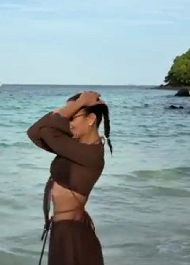 A woman stands in the shallow water of a tropical beach. She wears a brown two-piece outfit with a tie front top and a short skirt. She puts her hair up in a ponytail and then lets it down. She wears sunglasses and smiles. The water is clear and turquoise, and there is a small island in the background. A boat is also visible in the distance.