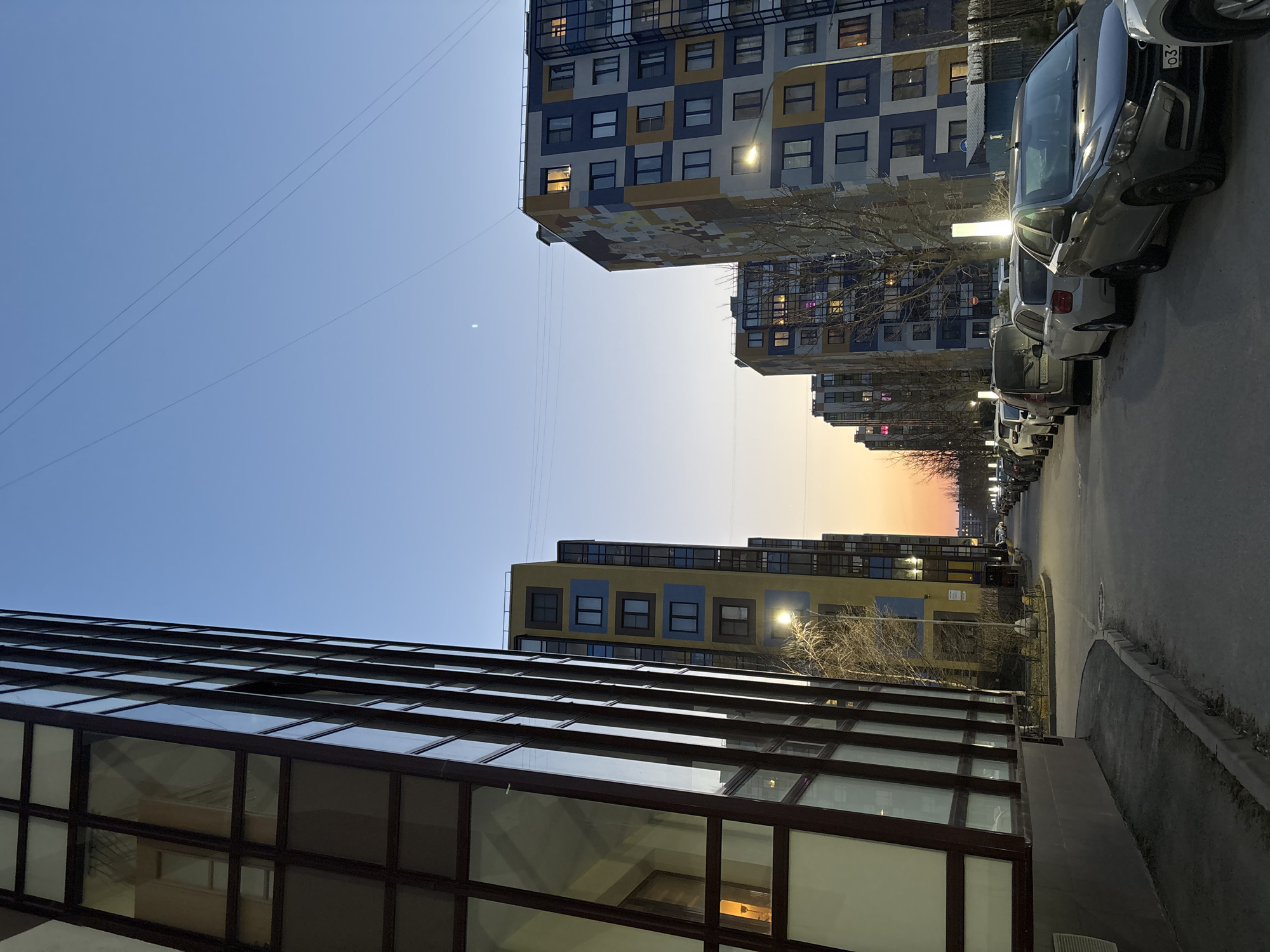 n urban scene in Kudrovo, Russia. Buildings are on either side of a street. On the right, cars are parked along the road, with taller buildings with multicolored facades in the background. On the left, a building with a glass facade dominates the foreground. In the distance, there is a sunset. Power lines stretch across the sky.