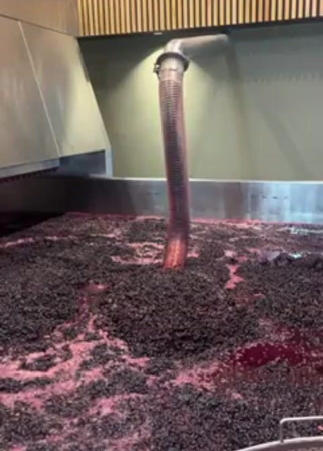 large stainless-steel vat filled with crushed purple grapes and juice. A flexible, corrugated hose is submerged in the grape mixture, attached to a metal pipe above. The background features a wall with vertical wood slats and a green section.