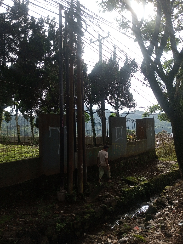An outdoor view captures a man near a low wall with graffiti. He wears a light-colored shirt and pants. A small stream flows along a rocky, cluttered streambed. Overhead, power lines crisscross the sky amidst tall poles and verdant trees, one large tree on the right side. A fence and rolling hills appear in the distance. The light is bright, possibly due to the sun shining directly through the trees.
