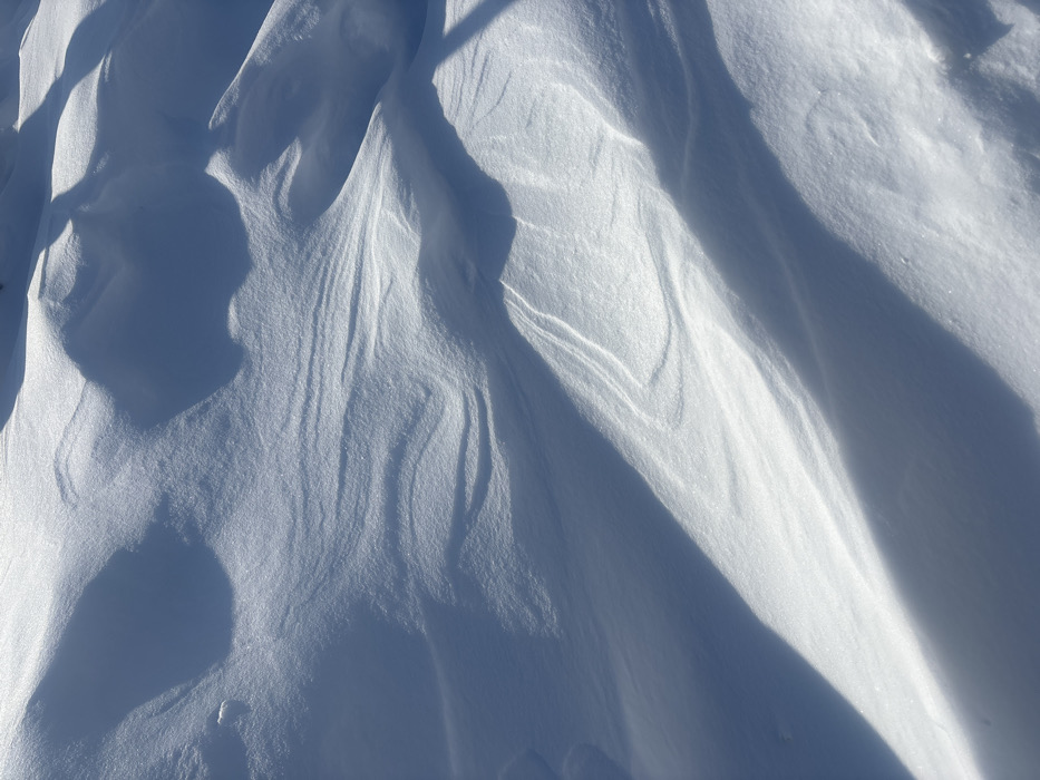 The image displays a close-up, ground-level view of a snow-covered surface in the city of Chaikovsky, Russia. The scene is illuminated by strong, direct sunlight, creating a high-contrast environment of bright white snow and deep blue-grey shadows. The snow is not flat but shows distinct, undulating, wind-sculpted formations, including ripples, soft drifts, and subtle crests and troughs. These formations create a dynamic pattern of light and shadow across the frame, highlighting the texture of the snow. Fine crystalline glints are visible in the brightly lit areas, indicating fresh or sparkling snow. There are no individuals, man-made objects, actions, or interactions depicted within the frame. The environment is exclusively natural snow, shaped by wind and lit by sun.