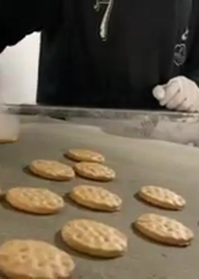 A person wearing a black long-sleeve shirt and white gloves stands at a light-gray conveyor belt, sorting light-tan colored round cookies