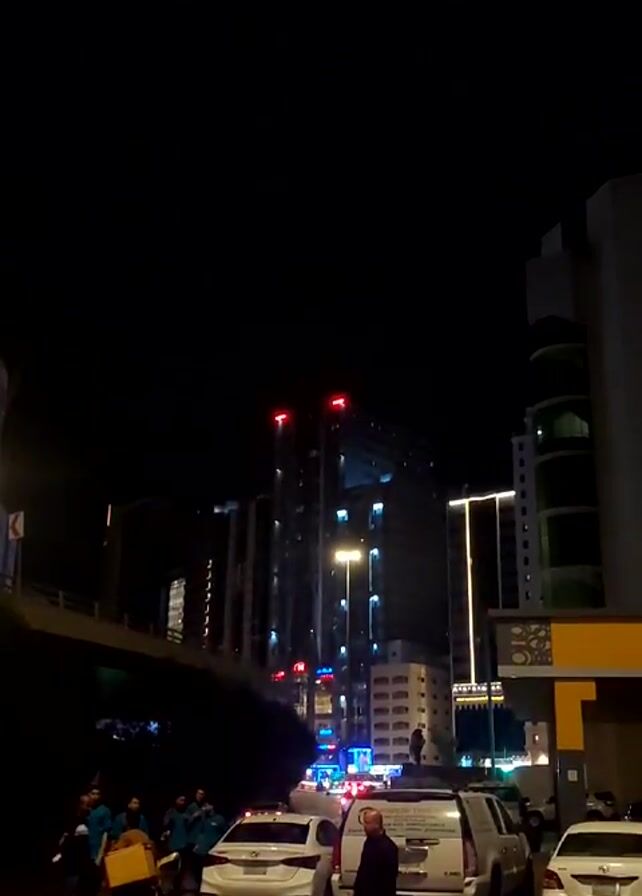At night, a city street scene shows several individuals standing on the sidewalk and near a few parked cars. A tall, modern building with a few illuminated sections is in the background. Emergency vehicle lights, possibly from police cars or ambulances, are visible further down the street near the building. An elevated road structure is visible on the left. The overall lighting is dim.