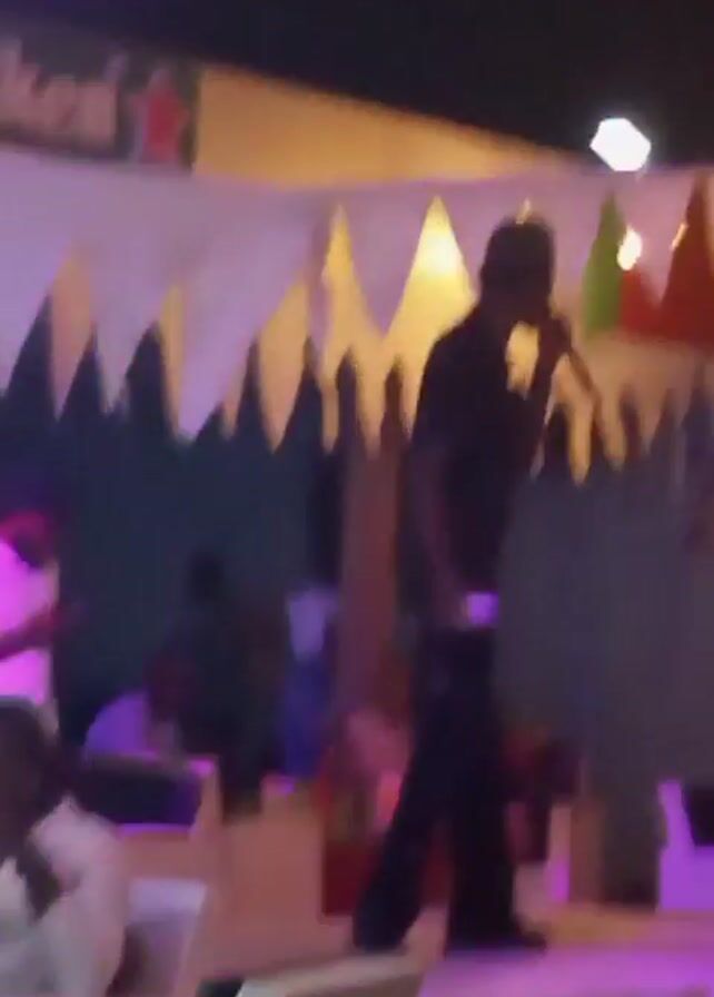 The video appears to be shot at an outdoor event venue. A man in a black shirt and pants is on a small stage with white tablecloths and decorative cutouts. He is performing, possibly singing into a microphone. There is a lighting rig above the stage with spotlights, and a Heineken sign is visible in the background. Some people are seated at tables in front of the stage, and a drummer with an orange hat is visible in the foreground. The stage lighting changes colors, shifting from pink to green to blue. Other people are present in the audience, moving around. Overall, the video captures a live music performance at a casual outdoor event.