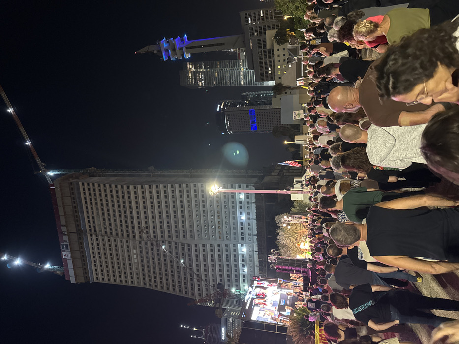 An upward-angled shot shows a densely packed crowd at an outdoor event at night. Skyscrapers are visible, one under construction with cranes. An American flag is displayed. The crowd appears focused on a stage area with lighting and sound equipment. The image suggests a concert or public gathering.