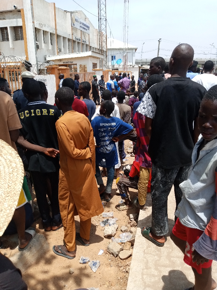 The scene is set in front of a building located at latitude 9.279 and longitude 12.453 in Jimeta, Nigeria. The building has a sign that reads "Jimeta Transmission Station." It is a light colored, one-story building with a flat roof. Several men, women, and children are gathered in front of the building. Most of the individuals are dressed in casual clothing, some are wearing traditional clothing. There are discarded plastic bags and trash on the ground. The men stand in a group talking amongst themselves and looking at the building. Some of the children are playing in the street while others sit on the ground. Some people are walking around the building. The scene is bright and sunny. There are trees and buildings in the background. The general atmosphere seems casual and relaxed.