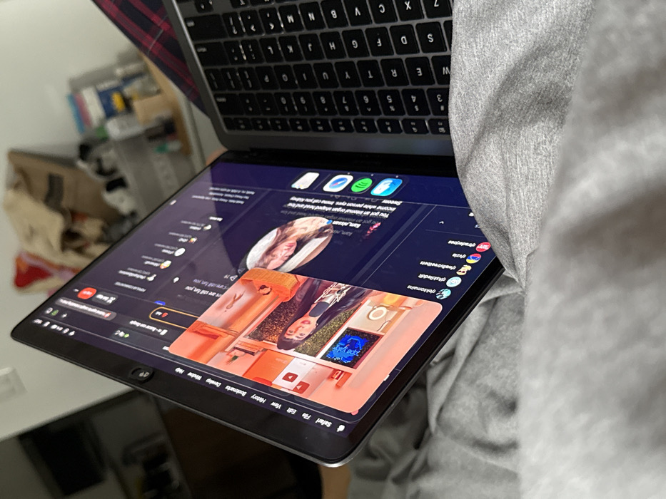 A laptop is open, displaying a social media or messaging application with a dark mode interface