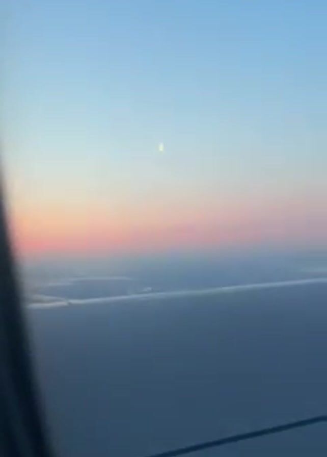 view from an airplane window. The sky is visible with a gradient of colors ranging from blue to pink as the sun sets or rises. The wing of the airplane is partially visible in the foreground, with some details like lines and yellow accents noticeable on its surface. In the sky, a small, crescent-shaped moon is visible. The overall scene gives a sense of being mid-flight during a transition between day and night.