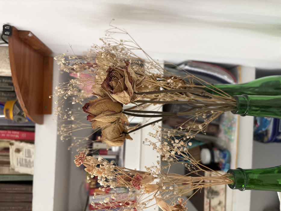 Two green bottles hold dried floral arrangements. The arrangements include roses in shades of beige and brown, along with sprigs of baby's breath and other dried foliage in similar neutral tones. The arrangements are set against a backdrop of books and household items, and the composition is horizontally flipped.