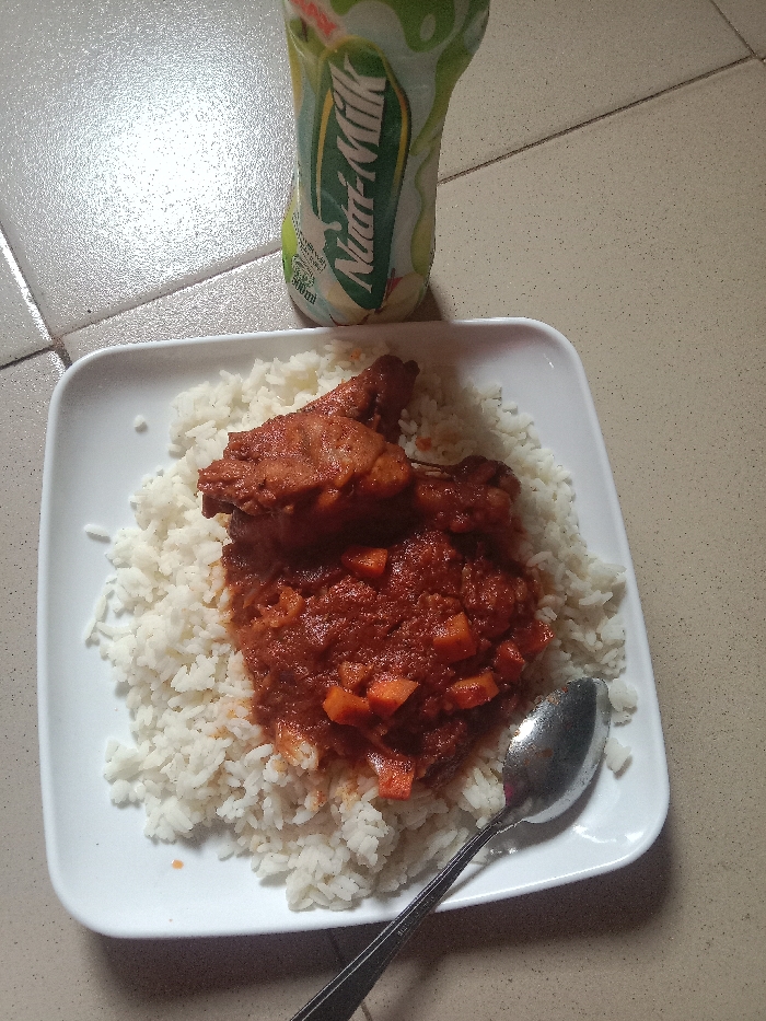 The scene in Oba, Nigeria, displays a meal and a beverage resting on a light-colored tiled surface. A white rectangular plate contains white rice, topped with a reddish-brown stew featuring visible orange, cubed vegetables and two pieces of cooked chicken, resembling drumsticks. A silver spoon rests on the right side of the plate, partially submerged in the rice. Behind the plate, an upright green and white plastic bottle labeled "Nutri-Milk" is visible. The tiled surface displays visible grout lines and reflections consistent with an overhead light source.