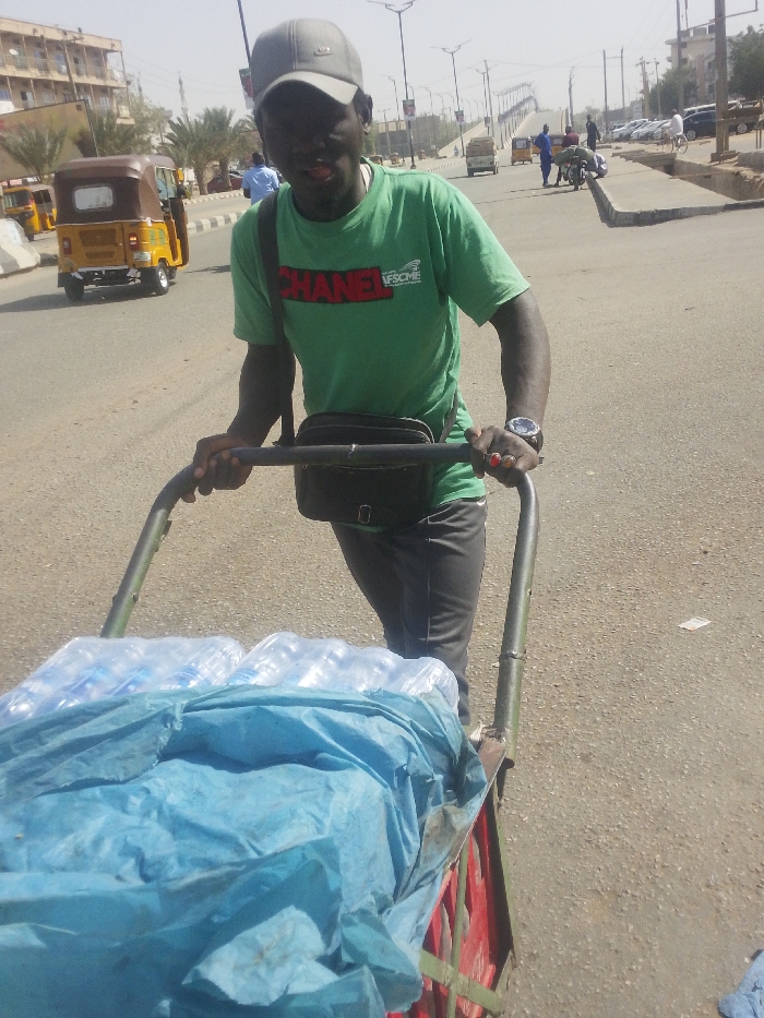 A dark-skinned male is depicted pushing a two-wheeled utility cart along a paved road in Gyadi Gyadi Arewa, Nigeria, under a hazy daylight sky