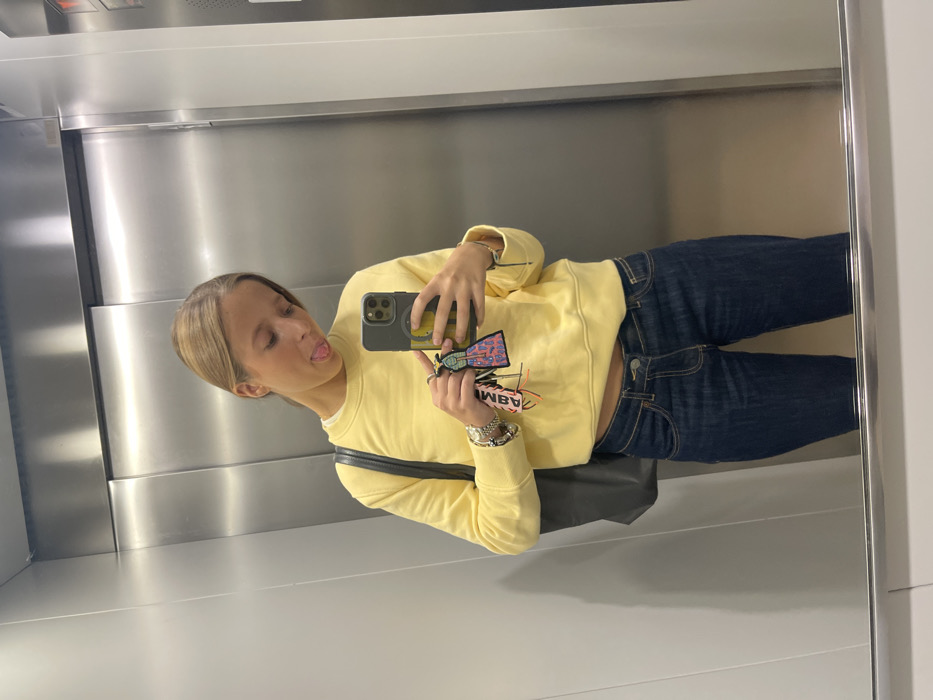 A young female is captured in a mirror selfie inside an elevator with polished metallic silver walls. The subject, visible from head to mid-thigh, has light brown hair pulled back and is making a playful expression by sticking out her tongue. She wears a light yellow long-sleeved sweatshirt over a white undershirt and dark blue denim jeans, exposing a small portion of her midriff. A dark shoulder bag strap is visible on her left side. Her left wrist displays a silver-toned wristwatch and several bracelets. In her right hand, she holds a dark-cased smartphone, angled towards the mirror to take the photograph. Attached to a ring, also held in her right hand, are keychains, including a white rectangular one with "BIMBA" written vertically in pink and another multi-colored, abstract-shaped design. A thin string bracelet is visible on her right wrist. The elevator's interior reflects a vertical white panel and a red indicator light from an unseen control panel to the right. The exact location within the city of Matosinhos, Portugal, cannot be determined from the provided image.