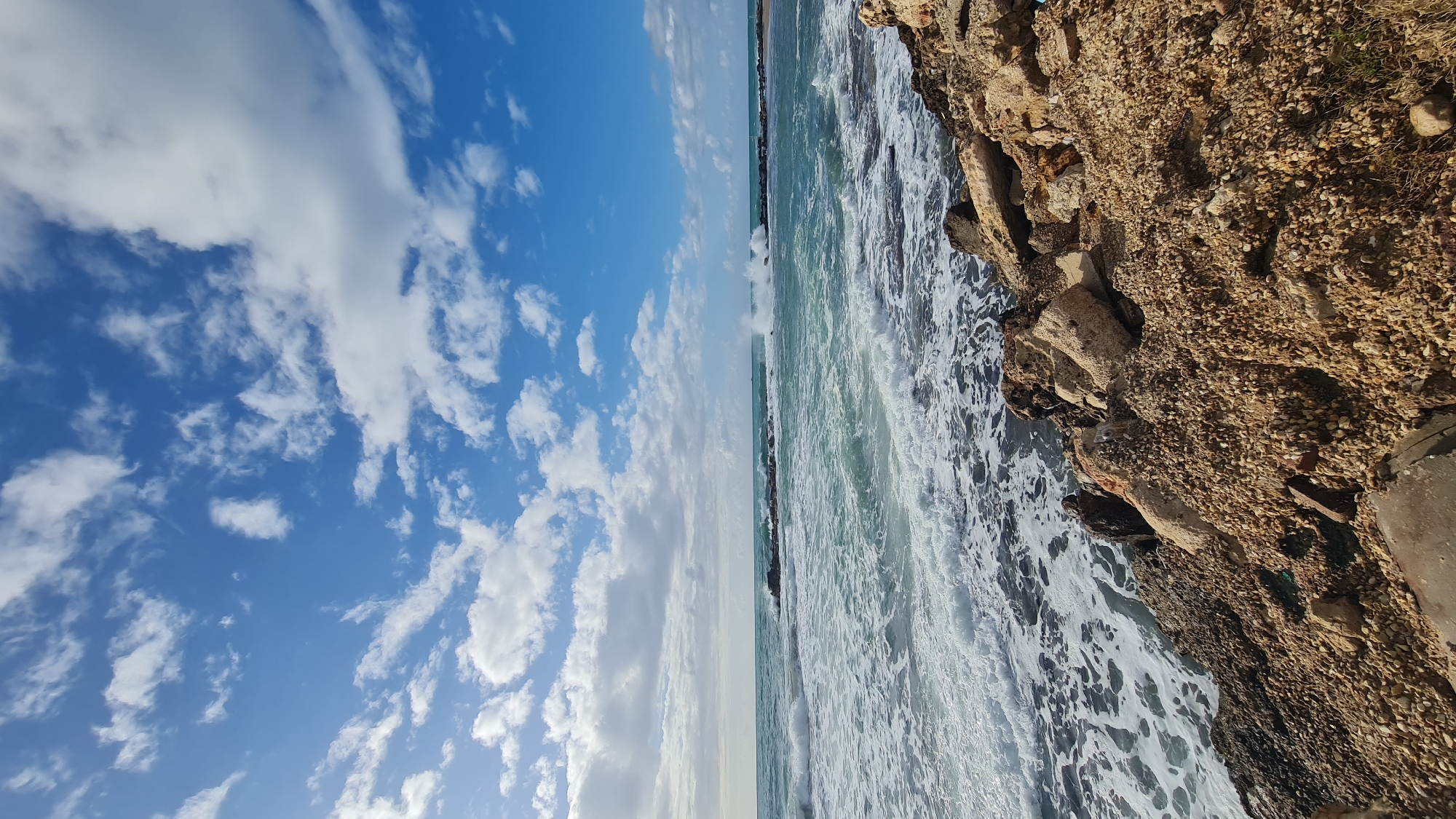 The image presents a view from a cliff or embankment overlooking the Mediterranean Sea, specifically in Nahariyya, Israel. The left half of the image captures a bright blue sky with scattered white cumulus clouds. The right half depicts the rugged coastline with rocks and the sea. The waves crash against the rocky shore, creating white foam. There are no people visible in the image.