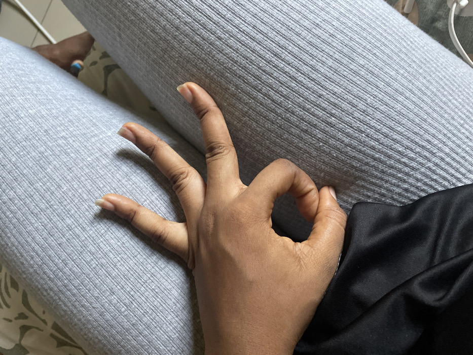 The image presents a close-up, top-down perspective focusing on a human right hand. The hand, exhibiting a medium-dark skin tone and naturally tipped fingernails, is positioned in an "OK" gesture; the thumb and index finger form a closed circle, while the middle, ring, and pinky fingers are extended upwards. The hand rests upon a surface of light grey, vertically ribbed fabric, indicative of leggings or sweatpants. A segment of plain black fabric is visible in the lower left portion of the frame, underneath the hand. In the background, between the implied wearer's legs, a small portion of a second limb, possibly a foot, is discernible, revealing a toenail painted light blue. Beneath this, a patterned fabric in tones of olive-green and beige is visible. The overall environment appears to be an indoor setting. No identifiable markers within the image specify the location as Ajaokuta, Nigeria.