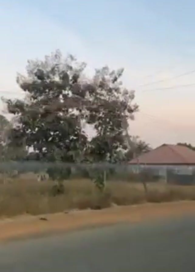 The video, shot from a moving vehicle, showcases a rural roadside scene. The environment is characterized by lush green trees and dry grasses lining the roadside. Several modest houses are visible, some with terracotta-colored roofs. A group of people can be seen standing outside one of the houses. The sky overhead is a pale blue, suggesting either early morning or late afternoon light.