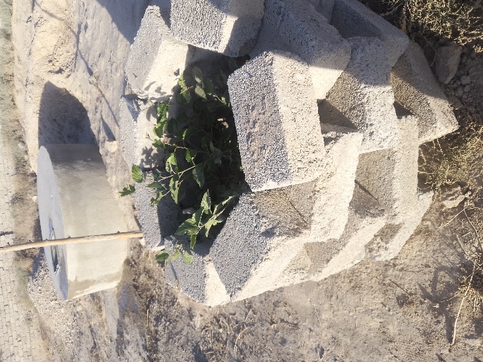 This image captures an outdoor, arid scene in Quetta, Pakistan. In the foreground, a roughly circular planter structure is constructed from stacked, light-colored, hollow concrete blocks. A small green leafy plant, resembling a sapling or shrub, grows within this block structure. Behind and to the left of the planter, a cylindrical concrete wellhead or water storage tank, light gray and capped with a flat top, is situated. A thin, light-colored wooden stick or stake stands vertically in the ground between the planter and the concrete well. The ground is composed of dry, light brown soil with sparse, withered vegetation. The background reveals additional dry, uneven terrain, indicating an undeveloped or semi-rural setting. No people are present, and no specific actions or interactions are depicted.
